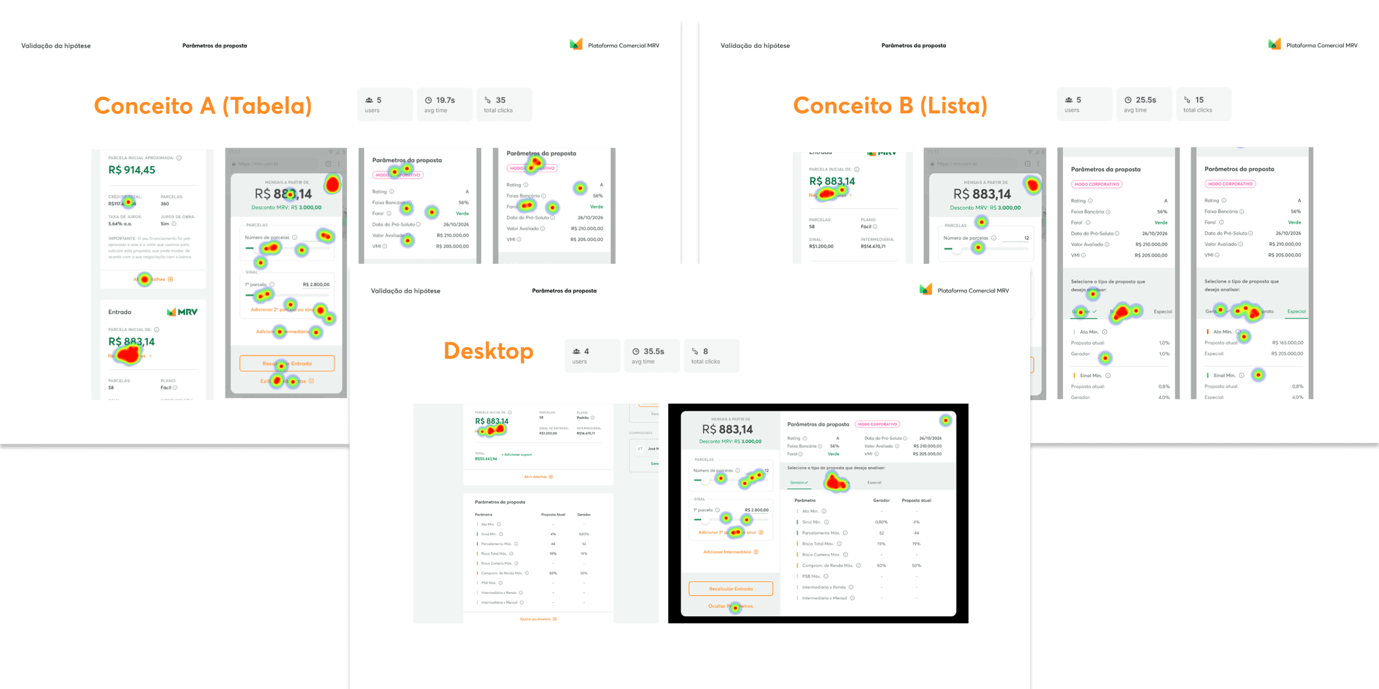 Para validar a solução antes do desenvolvimento, construí protótipos navegáveis em mobile e desktop e conduzi sessões com 5 participantes, entre gestores, gerentes e corretores. A proposta era avaliar desde o entendimento do problema até a experiência prática com os novos parâmetros.
