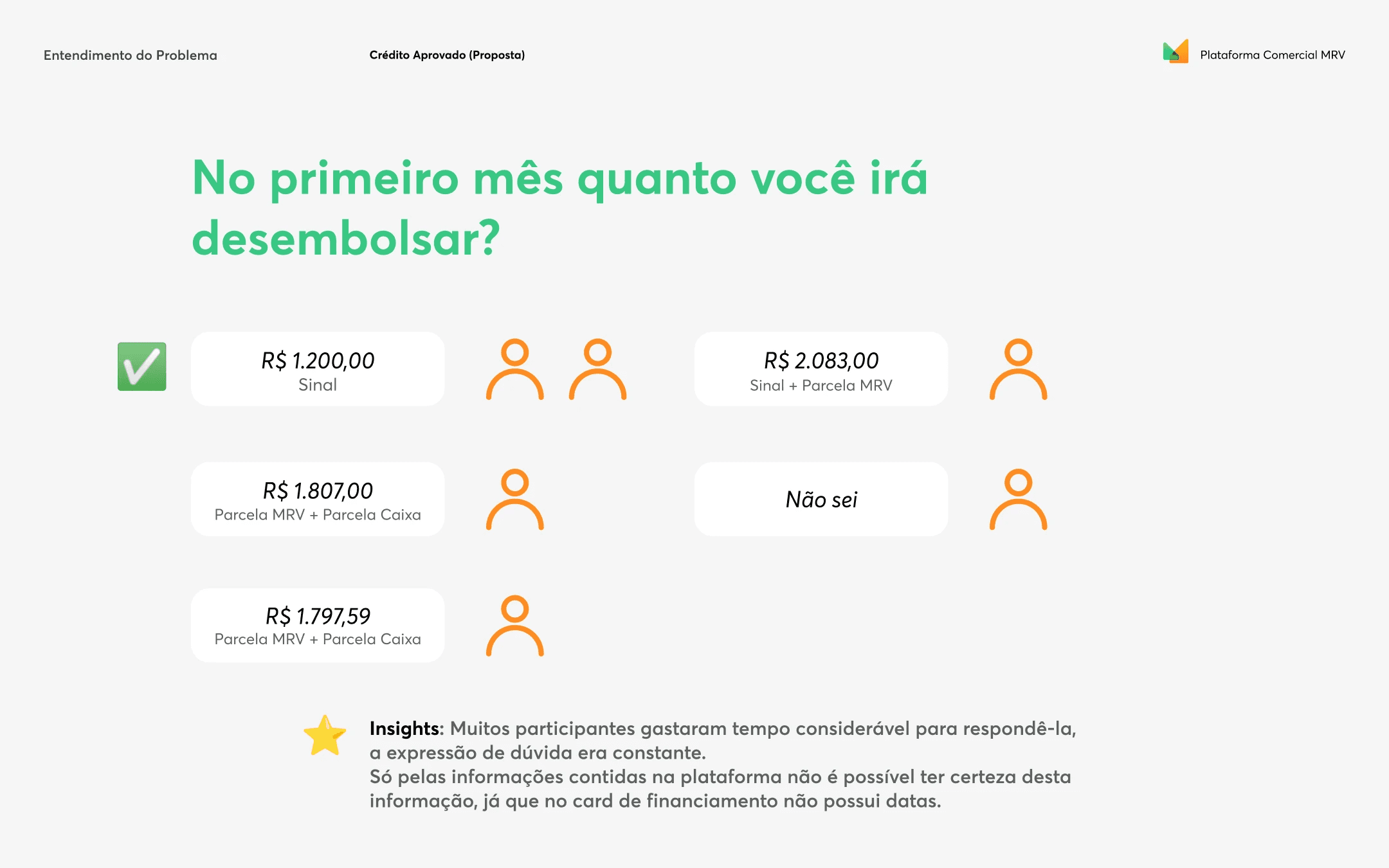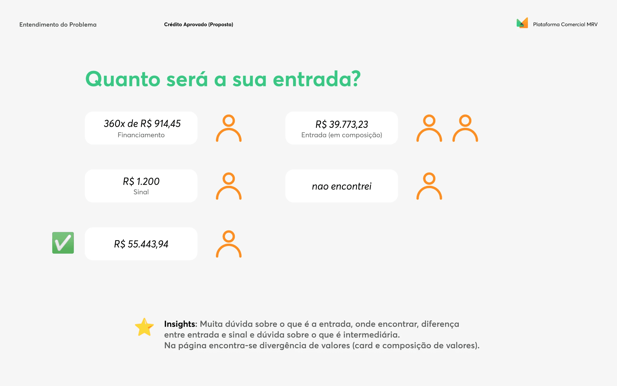 A tela de proposta gerava insegurança, dúvidas frequentes e até riscos jurídicos. Corretores muitas vezes evitavam mostrá-la aos clientes por não saberem como explicar os valores de forma clara, com receio de atrapalhar a negociação. Em alguns casos, mal-entendidos chegavam ao time jurídico, gerando conflitos no momento da assinatura do contrato.